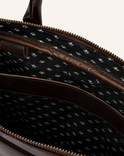 The design language of this briefcase is very slim, but don't be fooled. The bag is surprisingly spacious and adjusts to fit when full, with two separate padded compartments inside to safely store your laptop, laptop sleeve and accessories. There is also an additional card compartment and a small pocket for your smartphone. So you always have all your essentials with you.